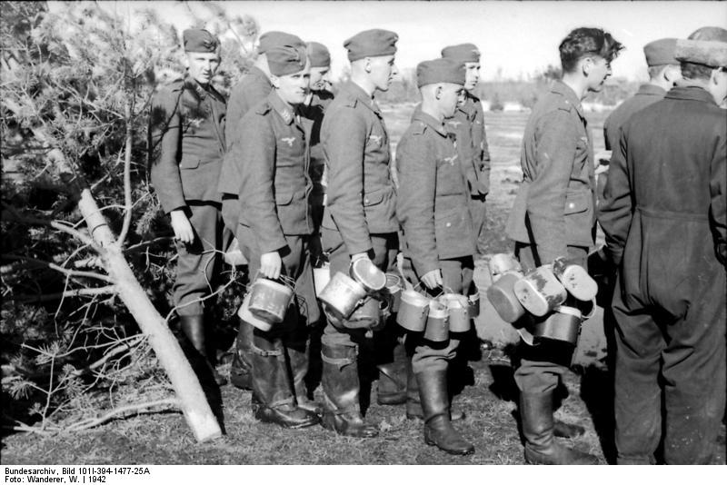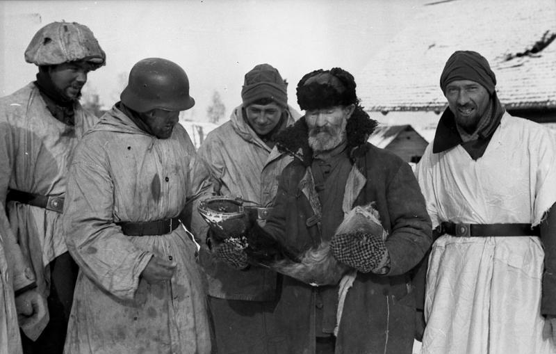 Zwei Soldaten der Waffen-SS vor brennendem Haus in der Nähe von Charkiw, Februar 1943 / Foto © Bundesarchiv, Bild 101III-Zschaeckel-186-36 / Zschäckel, Friedrich / CC-BY-SA 3.0 Deutsche Soldaten und ein älterer Mann mit einem Pferdebein, in der russischen Stadt Cholm (Oblast Nowgorod), Januar 1942 / Bundesarchiv, Bild 101I-004-3648-16 / Muck, Richard / CC-BY-SA 3.0 Ausgabe von Brot an gefangene Rotarmisten im Lager in Winnyzja, Juli 1941 / Foto © Bundesarchiv, Bild 146-1979-113-04 / Hübner / CC-BY-SA 3.0