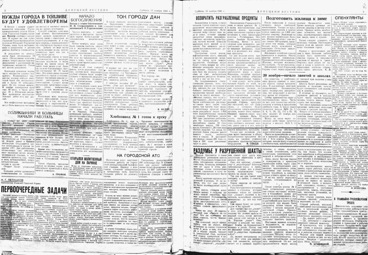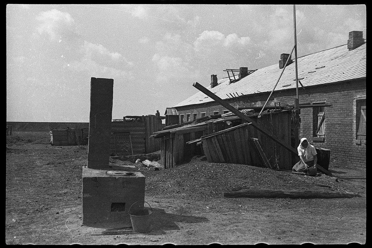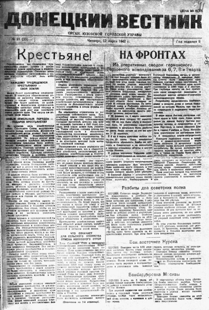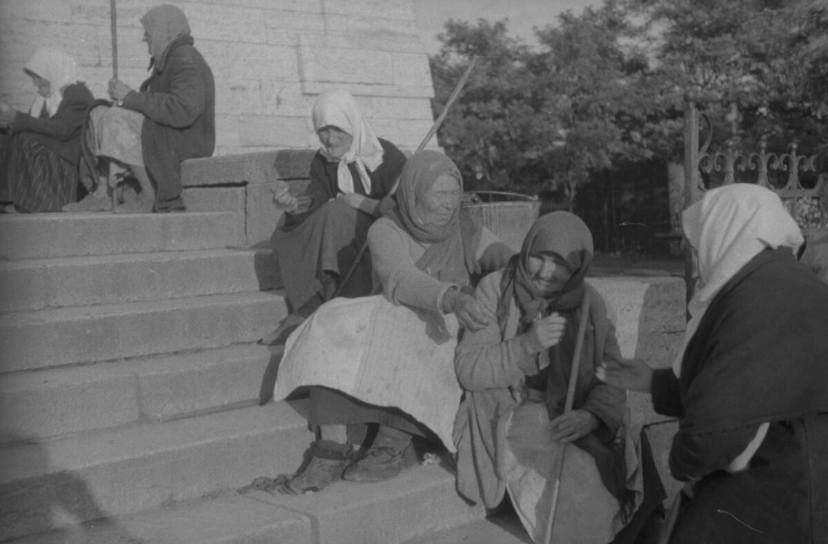 Propaganda Zeitung „Donezki Westnik“ vom 13. November 1941: „Bolschewiken und Juden haben, als sie die Stadt in Todesangst verließen, die Industrie- und Nahrungsmittelbetriebe zerstört. Der rachsüchtige Mohr hat sein Werk getan und ist gegangen“ / Bild: gemeinfrei Frauen sitzen am Eingang einer Kirche, Kislowodsk–Pjatigorsk, Westkaukasus, UdSSR (Russland). Sommer 1942 / Foto: Eberhardt © Privatsammlung von Arthur Bondar Sowjetische Kriegsgefangene heben vom Boden auf und legen in ihre Mützen Zwiebackstücke, die ihnen von den Deutschen auf die Erde geworfen wurden, Oblast Smolensk, UdSSR (Russland), 1941–1942 / Foto: unbekannter Fotograf © Privatsammlung von Arthur Bondar Eine Frau sitzt vor dem Haus, Rostow am Don, Sowjetunion, Juli 1943 / Foto: Eberhardt © Privatsammlung von Arthur Bondar