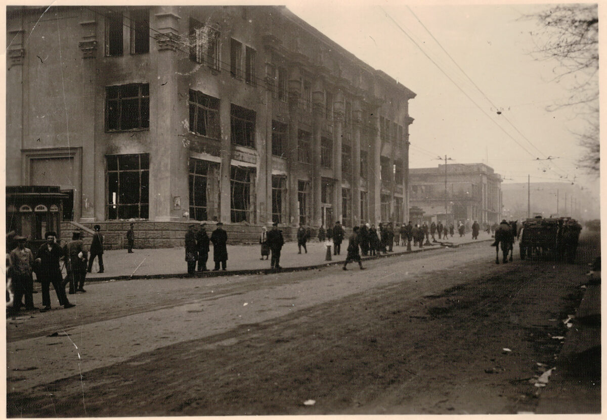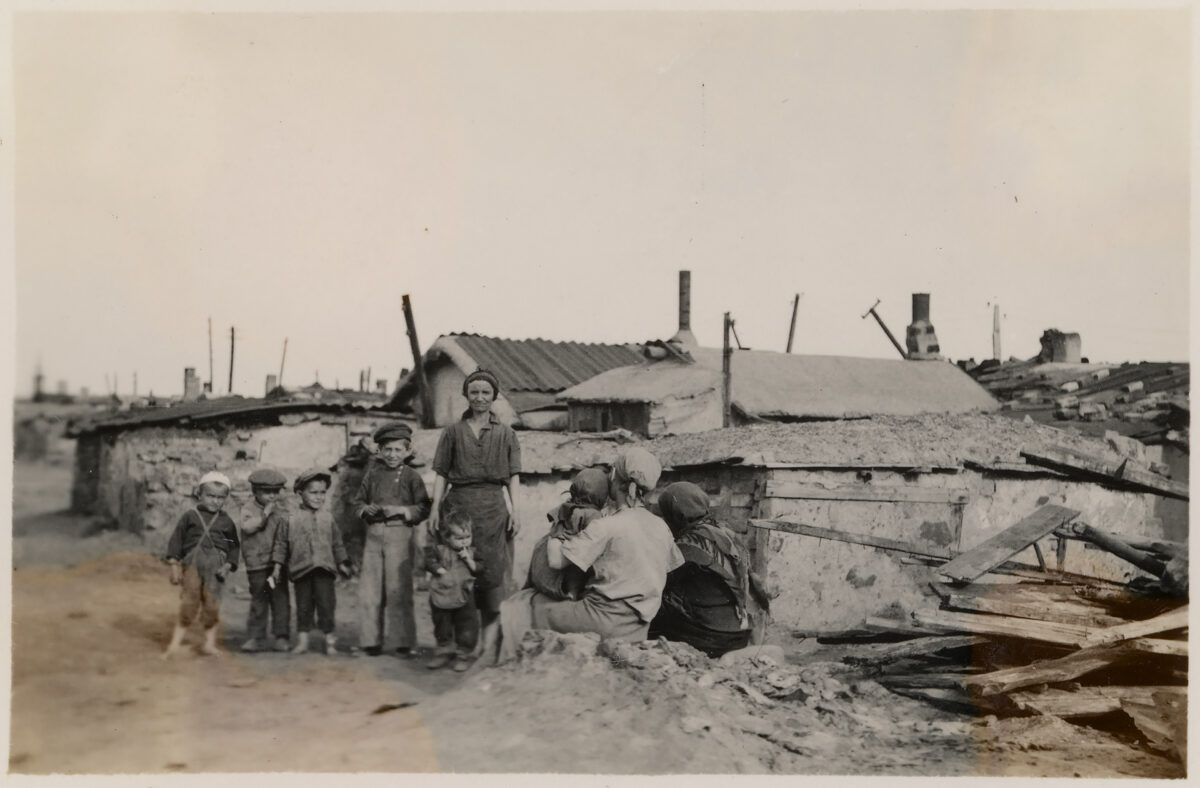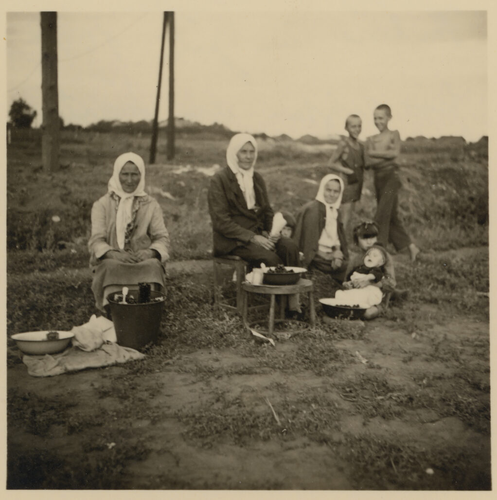 Propaganda Zeitung „Donezki Westnik“ vom 13. November 1941: „Bolschewiken und Juden haben, als sie die Stadt in Todesangst verließen, die Industrie- und Nahrungsmittelbetriebe zerstört. Der rachsüchtige Mohr hat sein Werk getan und ist gegangen“ / Bild: gemeinfrei Frauen sitzen am Eingang einer Kirche, Kislowodsk–Pjatigorsk, Westkaukasus, UdSSR (Russland). Sommer 1942 / Foto: Eberhardt © Privatsammlung von Arthur Bondar Sowjetische Kriegsgefangene heben vom Boden auf und legen in ihre Mützen Zwiebackstücke, die ihnen von den Deutschen auf die Erde geworfen wurden, Oblast Smolensk, UdSSR (Russland), 1941–1942 / Foto: unbekannter Fotograf © Privatsammlung von Arthur Bondar Eine Frau sitzt vor dem Haus, Rostow am Don, Sowjetunion, Juli 1943 / Foto: Eberhardt © Privatsammlung von Arthur Bondar