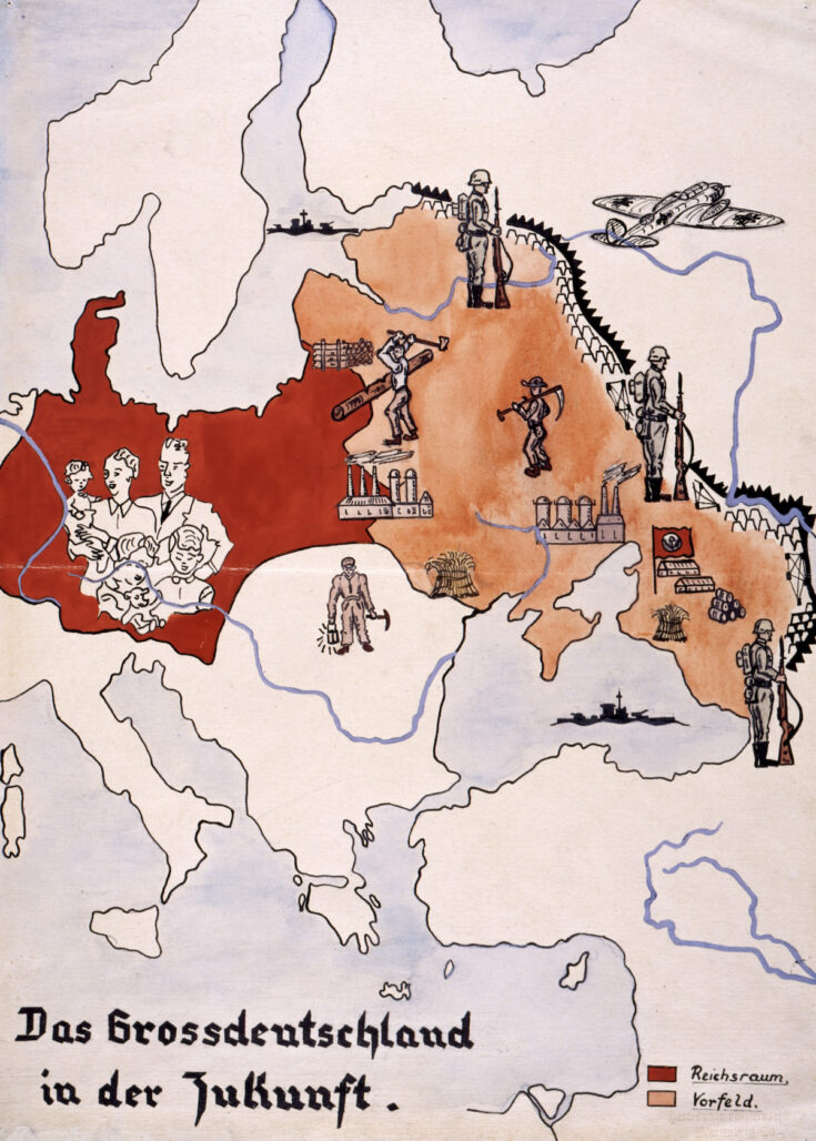 Die handgezeichnete Kartenskizze illustriert großdeutsche Fantasien vom „Neuen Europa“: Der „Osten“ versorgt das Deutsche Reich mit Produkten aus Industrie und Landwirtschaft, April 1943 / Bild © Deutsches Historisches Museum, Berlin / Inv.-Nr.: Do 61/144 Das ausgebrannte Zentralkaufhaus in Stalino, Herbst 1941 / Foto © unbekannter Fotograf / dekoder.org Straßenmarkt in der durch Bombenangriffe zerstörten Stadt Smolensk, Russland, 1941 / Foto: unbekannter Fotograf © Privatsammlung von Arthur Bondar Bewohner·innen von Stalino, Sommer 1942 / Foto © unbekannter Fotograf / dekoder.org Ältere Frauen verkaufen Obst und Gemüse am Rand einer Straße in Stalino, Sommer 1943 / Foto © unbekannter Fotograf / dekoder.org
