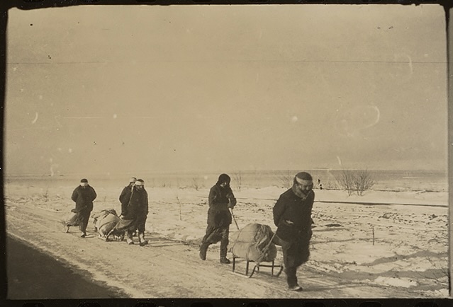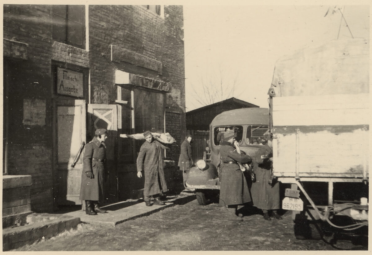 Drei Männer bringen Tote zum Friedhof im belagerten Leningrad, Oktober 1942 / Foto © RIA Novosti archive, image #216 / Boris Kudoyarov / CC-BY-SA 3.0 Fleischausgabe der Wehrmacht im besetzten Stalino, 1941-1942 / Foto © unbekannter Fotograf / dekoder.org Zivilist·innen im Donbas mit beladenen Schlitten, Winter 1942 in der Nähe von Stalino / Foto © unbekannter Fotograf / dekoder.org