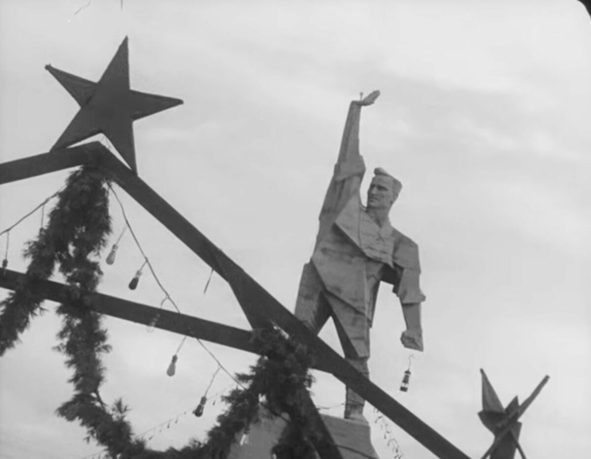 Propaganda-Plakat „Donbass – das Herz Russlands“, 1921 / Bild © gemeinfrei / The New York Public Library Digital Collections Olexij Stachanow (rechts) mit einem Bergarbeiter, 1930er Jahre / Foto © gemeinfrei / Library of Congress Denkmal „Genosse Artjom“ (Fjodor Sergejew) in Bachmut – einem der führenden Revolutionären und Bolschewik im Donbas. Das Denkmal wurde im Zweiten Weltkrieg zerstört / Szene aus dem Film „Enthusiasmus – Donbas Sinfonie“ von Dsiga Wertow (1931) © gemeinfrei / Wikimedia Das Metallwerk in Stalino (Donezk), ca. 1942 / Foto: unbekannter Fotograf / dekoder.org