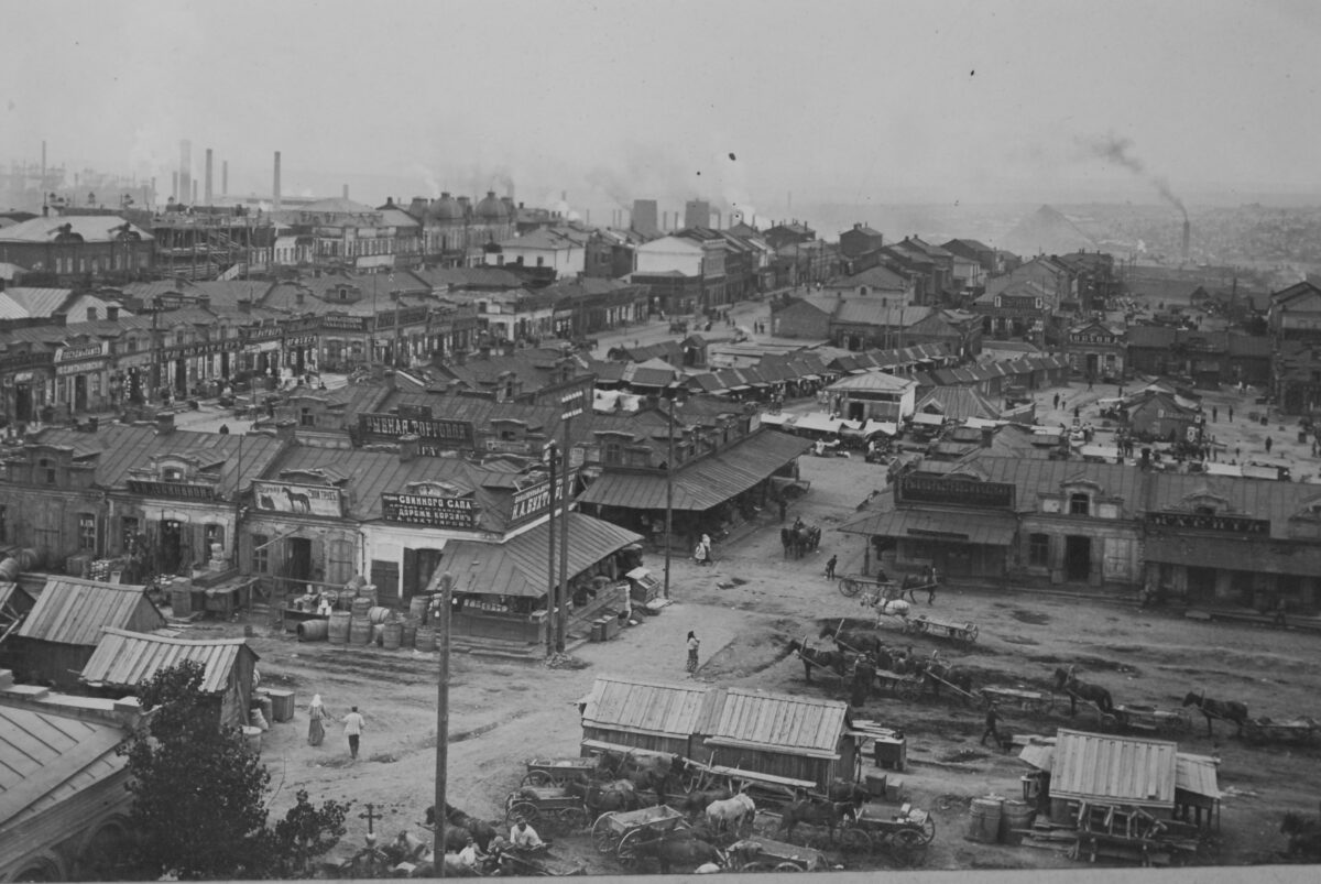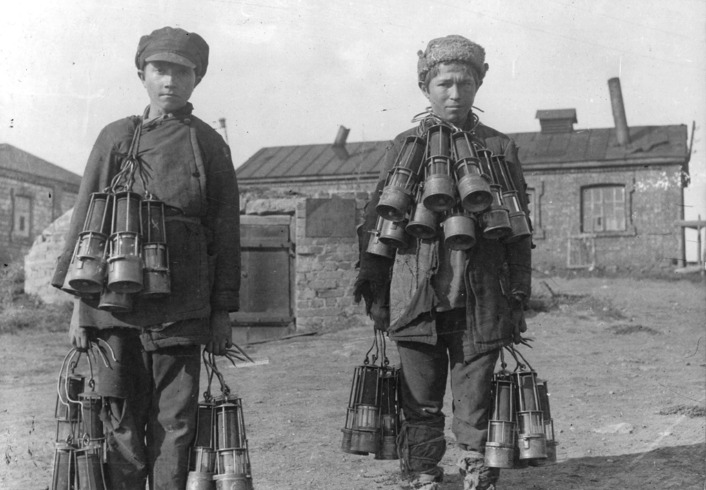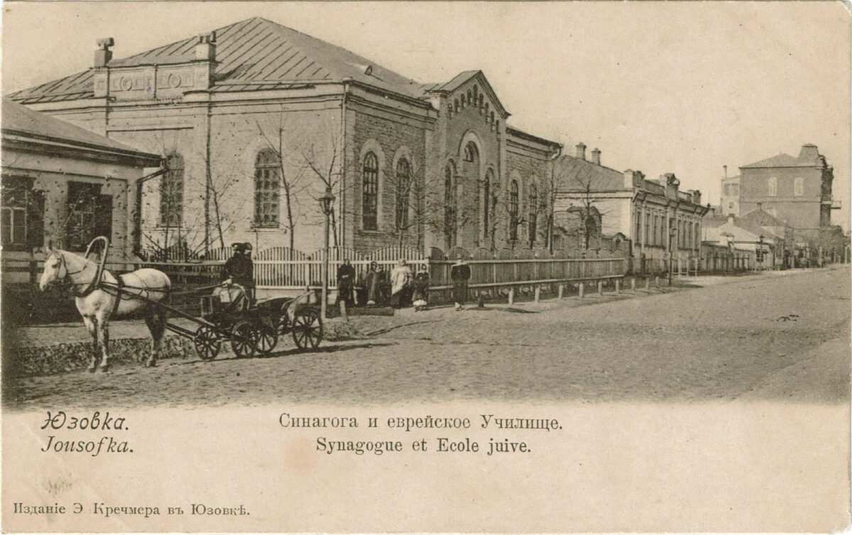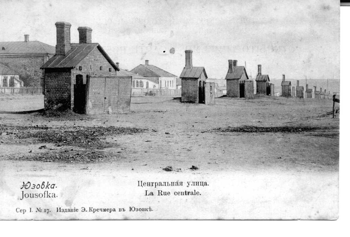 Die ersten Gebäude der Siedlung Jusiwka (Donezk), 1872 / Foto: unbekannter Fotograf © gemeinfrei / Museum des metallurgischen Werks in Donezk / Wikimedia Blick auf die Siedlung Jusiwka mit Baracken der Arbeiter, aufgenommen von der Halde des Schachts „Zentralnaja“, 1890er Jahre / Foto: unbekannter Fotograf / gemeinfrei / Wikimedia Bergarbeiter bei der Kohleförderung im Bergwerk N8 in der Siedlung Wetka nördlich von Jusiwka (Donezk), 1900er Jahre / Foto: unbekannter Fotograf / gemeinfrei / Wikimedia Lampenwärter im Bergwerk „Butowka“ nördlich von Jusiwka (Donezk) vor 1917 / Foto: unbekannter Fotograf / gemeinfrei / Wikimedia Die Synagoge und die jüdische Schule in Jusowka (Donezk), ca. 1900 / Foto: Postkarte, unbekannter Fotograf / gemeinfrei / Wikimedia