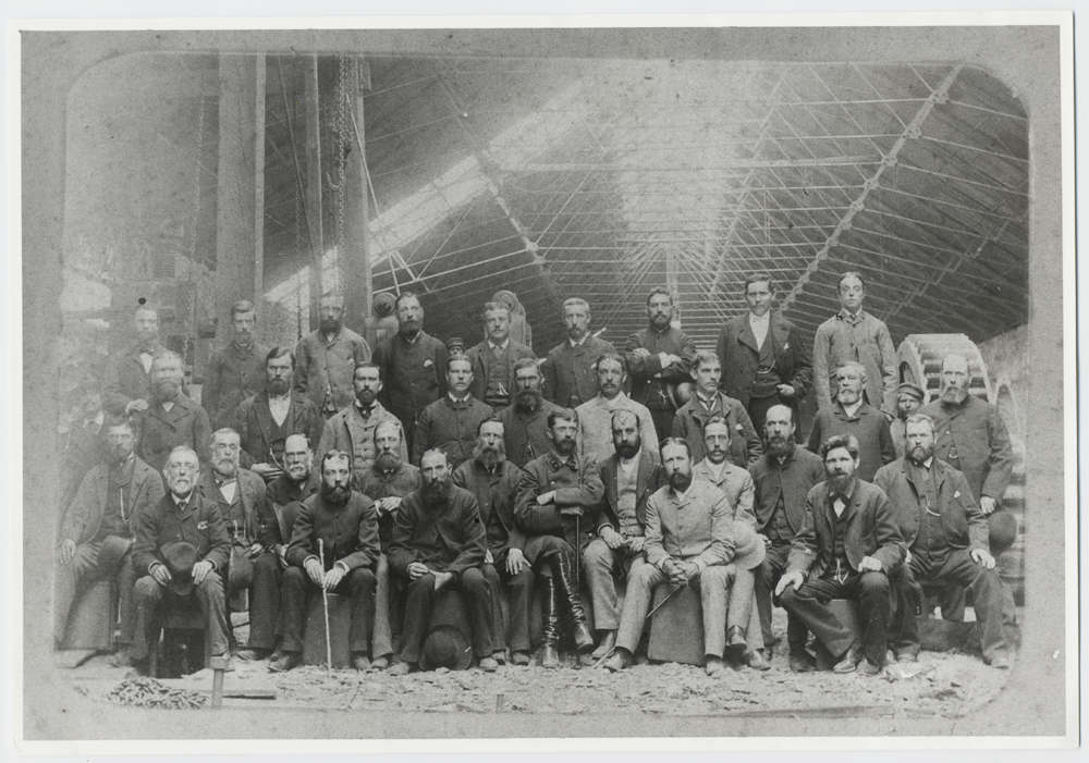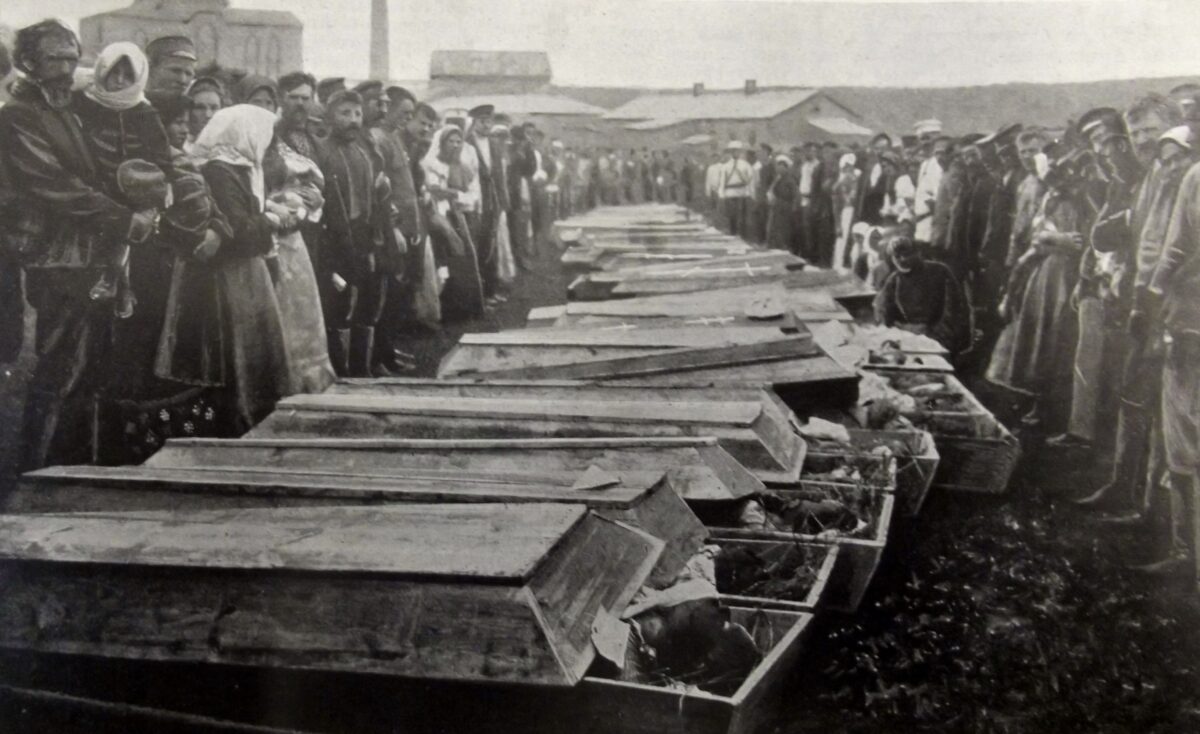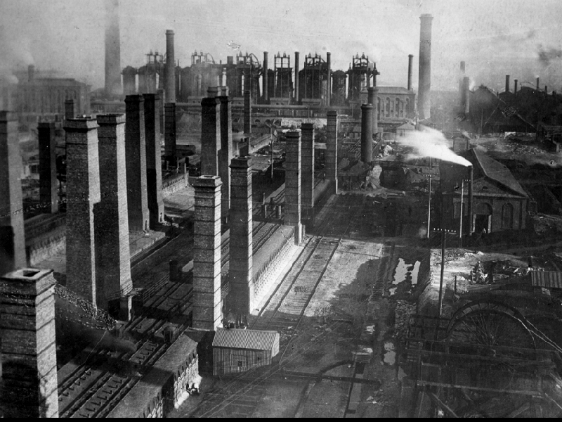 John James Hughes (zweiter von rechts in der vorderen Reihe) mit englischen Arbeitern und Ingenieuren in Jusiwka (Donezk), 1889 / Foto: unbekannter Fotograf / gemeinfrei / Wikimedia Arbeiter im metallurgischen Werk in Jusiwka, 1900er Jahre / Foto: unbekannter Fotograf / gemeinfrei / Wikimedia Koksofenanlagen des metallurgischen Werks in Jusiwka, 1900er Jahre / Foto: unbekannter Fotograf / gemeinfrei / Wikimedia Beerdigung von verungkückten Bergarbeitern des Bergwerks Rykowski östlich von Jusiwka / Foto: ungenannter Fotograf, aus der Zeitschrift „Niwa“, 31, 1908 / gemeinfrei / Wikimedia