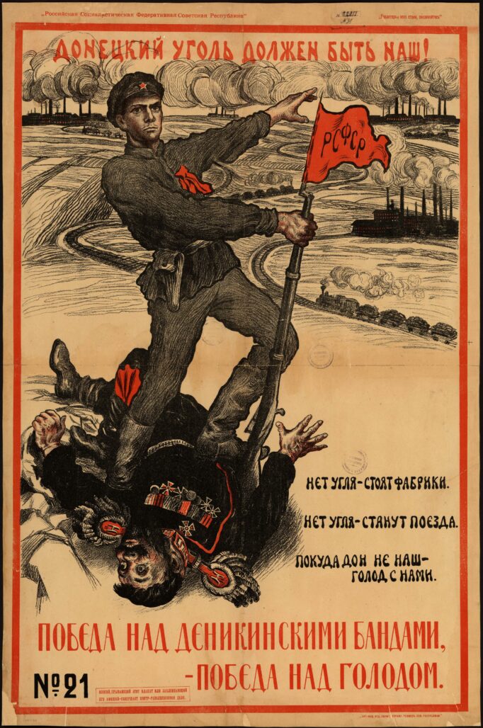 Marktplatz in Jusiwka (Donezk), 1900er Jahre / Foto: unbekannter Fotograf / gemeinfrei / Museum des metallurgischen Werks in Donezk / Wikimedia Zentralstraße in Jusiwka (Donezk), 1900er Jahre / Foto: Postkarte / gemeinfrei / Wikimedia Propagandaplakat aus der Zeit des Bürgerkrieges „Die Donezker Kohle muss uns gehören. Ohne Kohle stehen die Fabriken still, ohne Kohle bleiben die Züge stehen. Solange der Don nicht unser ist, werden wir hungern“ / Bild © gemeinfrei / Wikimedia