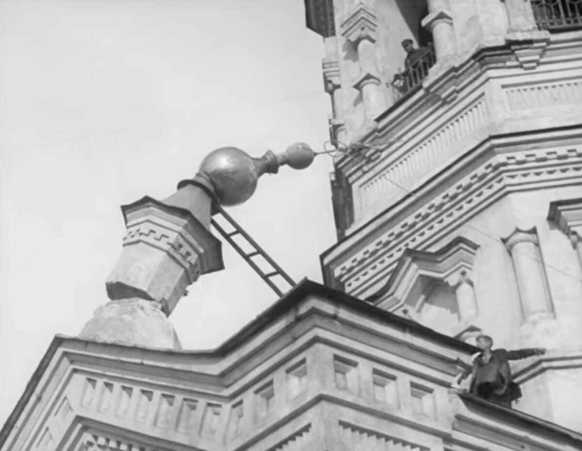 Der Abriss der Kirchenkuppel in Bachmut / Szene aus dem Film „Enthusiasmus – Donbas Sinfonie“ von Dsiga Wertow (1931) © gemeinfrei / Wikimedia Der Schachty-Prozess – OGPU-Mitarbeiter führen die Angeklagten ab, 1928 / Foto: unbekannter Fotograf © aus dem Archiv der Zeitschrift „Ogonjok“, gemeinfrei / Wikimedia Der Schachty-Prozess, 1928 / Foto: unbekannter Fotograf © auf dem Archiv der Novaya Gazeta / Wikimedia Eine enteignete „Kulaken“-Familie vor ihrem Haus im Dorf Udatschne, Oblast Stalino (Donezk), 1930er Jahre / Foto © unbekannter Fotograf / gemeinfrei / Wikimedia NS-Propagandafoto: Einmarsch der deutschen Truppen in Stalino (Donezk), 6. November 1941 / Foto: Arndt / dekoder.org